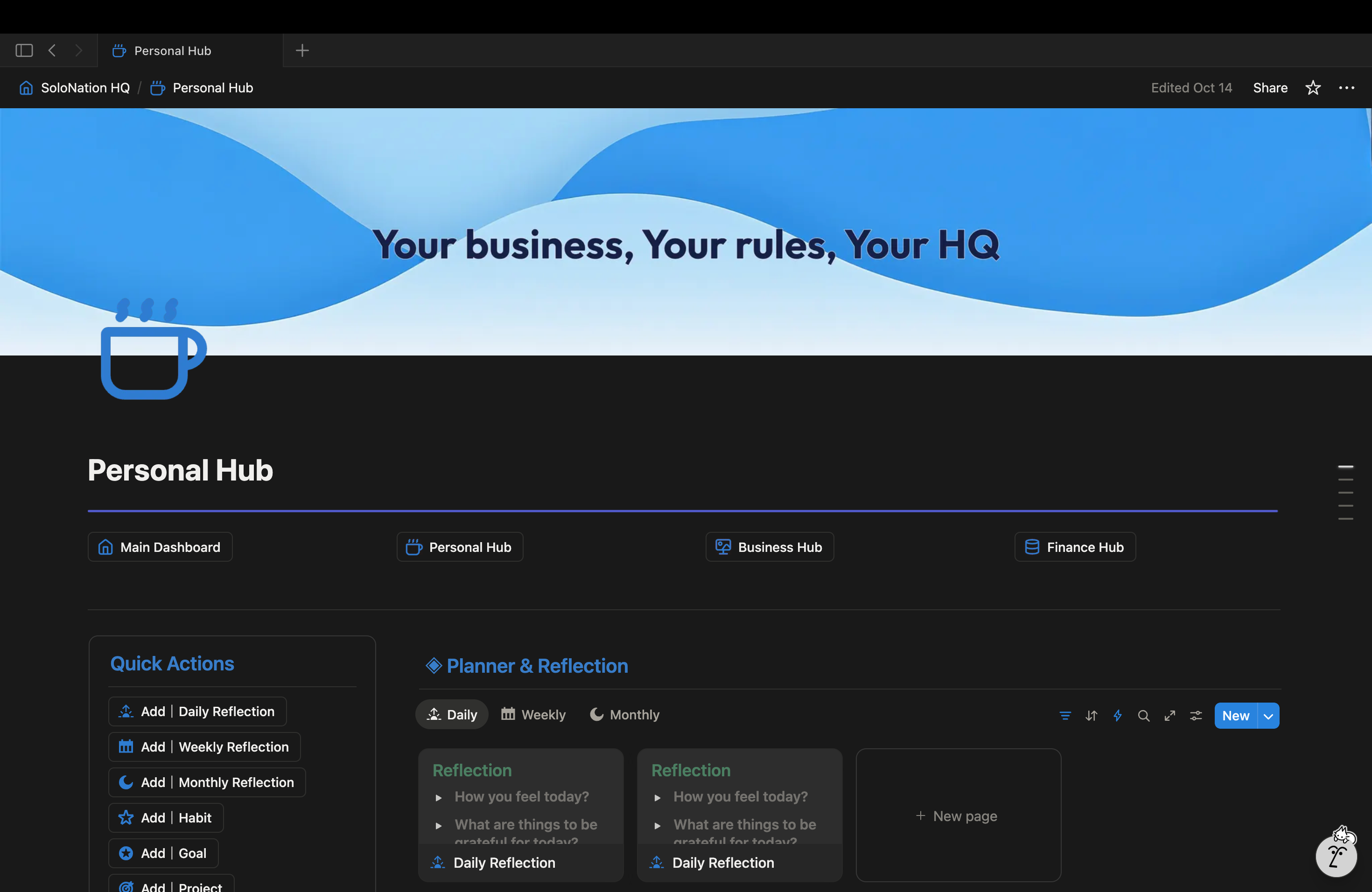 A sleek, intuitive Notion workspace that brings your business and personal life together — everything in one clean dashboard.